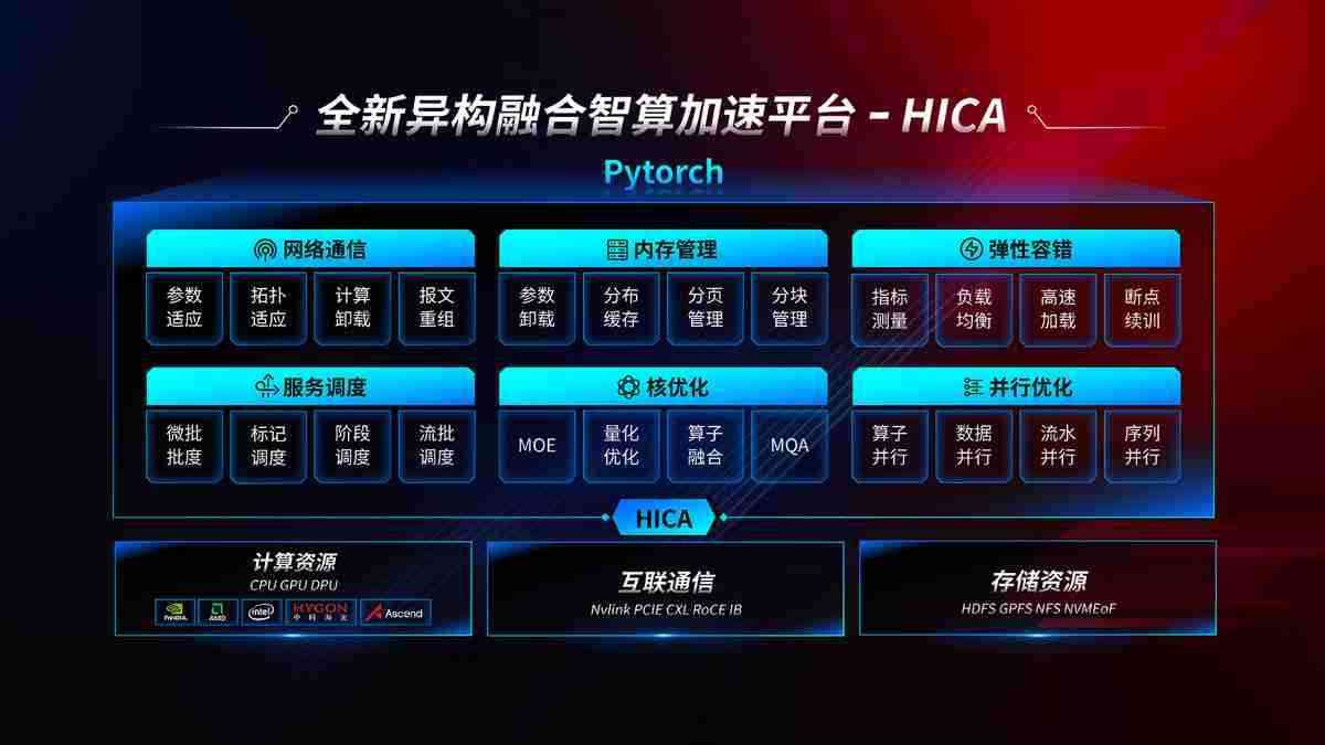 通过自研的服务层、、中间适配层、、、以及调度编排算法,,采用数据并行、、、、模型并行等多种并行方式,,把并行计算任务进行有效的分解,,使其分别由相应的软件栈和算力资源来承接。。。。当GPU资源变化,,,HICA可以实时动态调度计算子任务并调整模型拓扑和架构,,,以充分聚合各种算力资源。。。